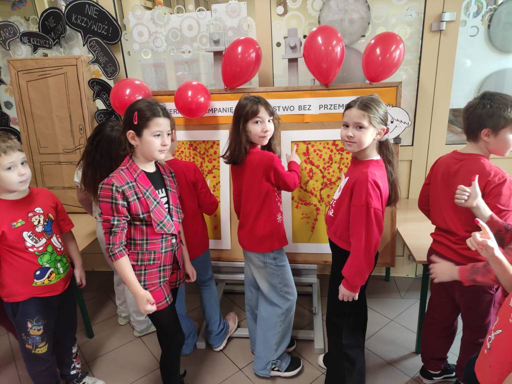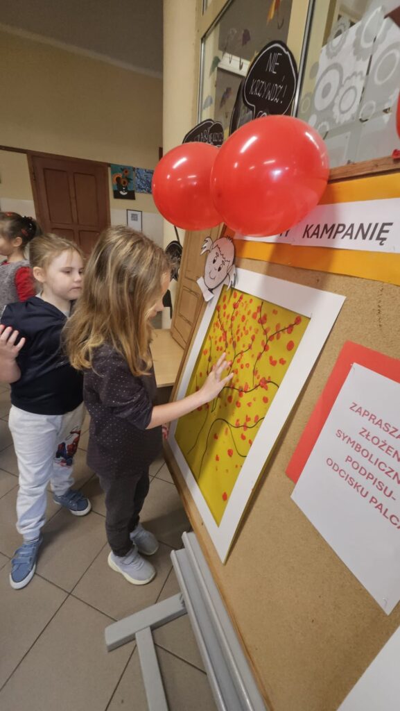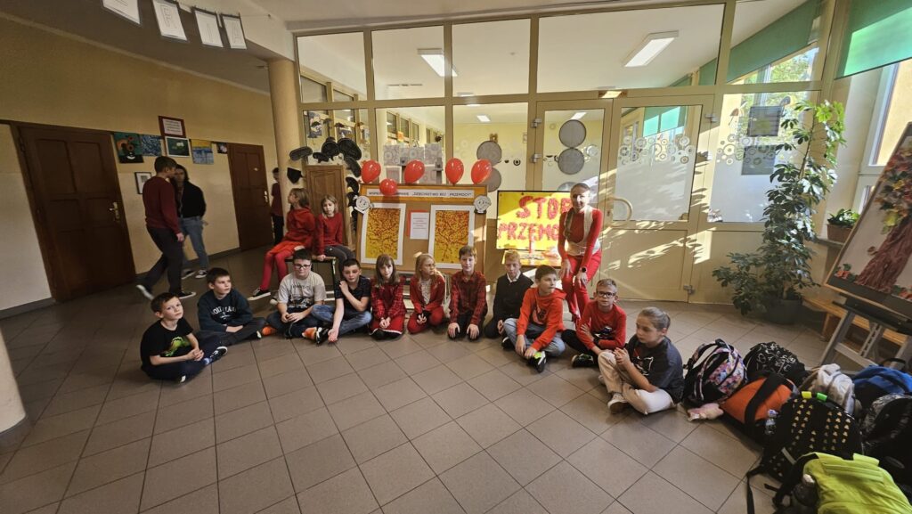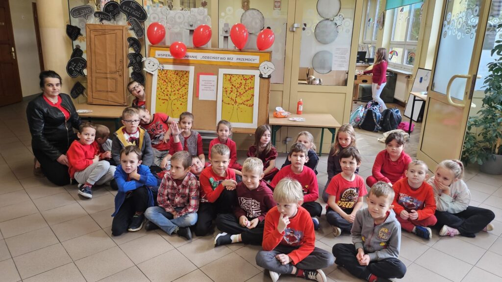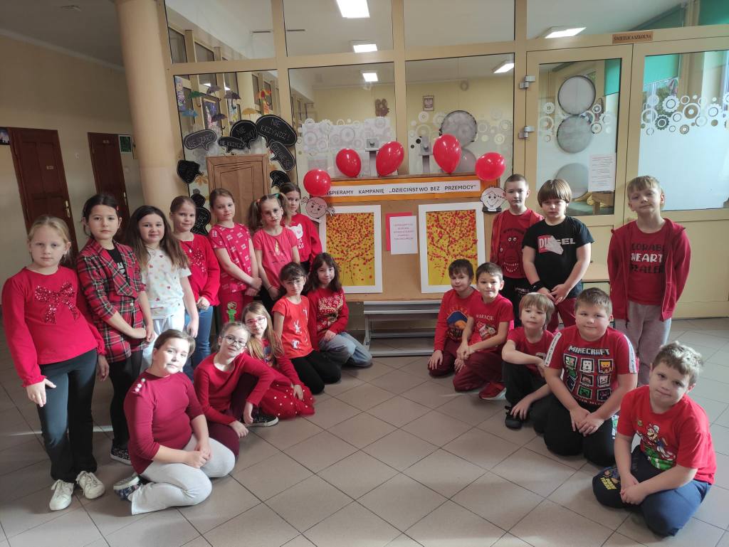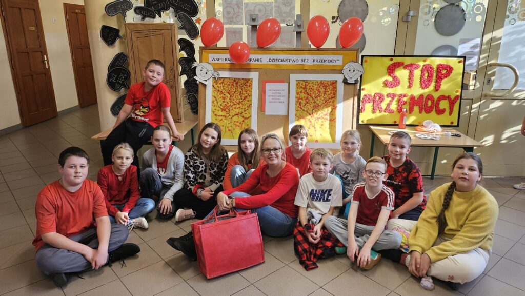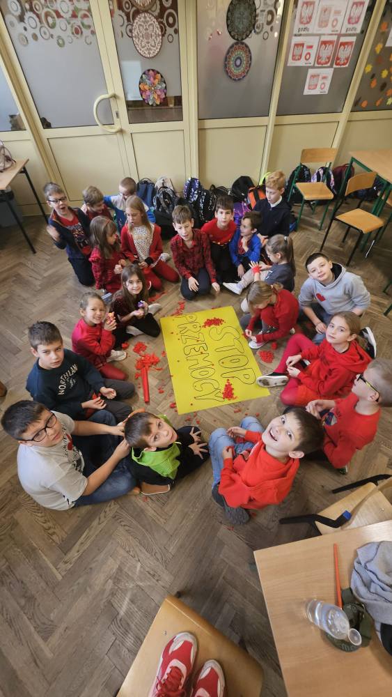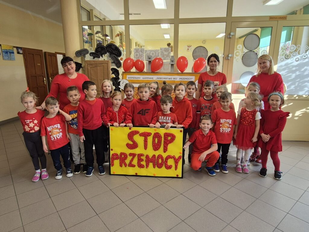 14 listopada w związku z ogólnopolską kompanią ” Dzieciństwo bez przemocy „w naszej szkole odbyły się różne zajęcia i akcje promujące właściwe zachowania wobec dzieci. Wyrazem wsparcia kampanii były symboliczne podpisy uczniów- odciski palców. W klasach odbyły się pogadanki, najstarsi uczniowie ułożyli na sali gimnastycznej hasło ” Stop przemocy „. Kulminacją akcji będzie podświetlenie szkoły na czerwono jako wyraz poparcia dla kampanii. Dziękujemy wszystkim za zaangażowanie, a naszym uczniom życzymy dorastania w spokojnym, wspierającym środowisku- bez agresji i przemocy.