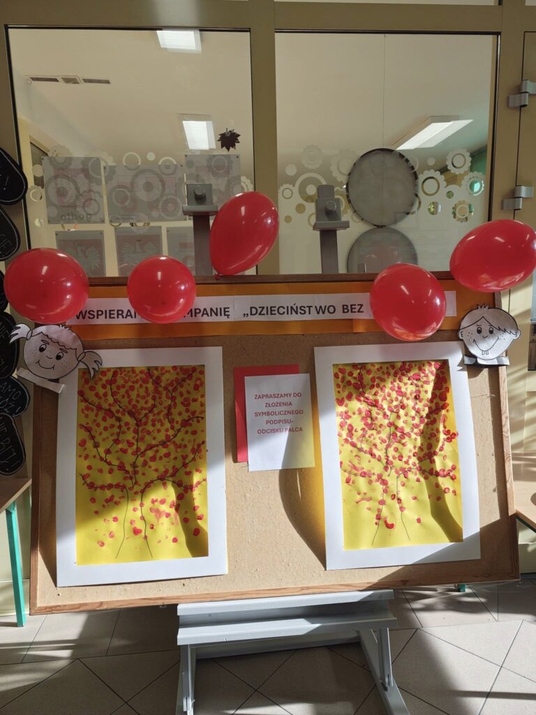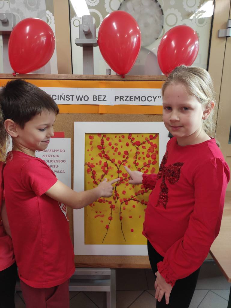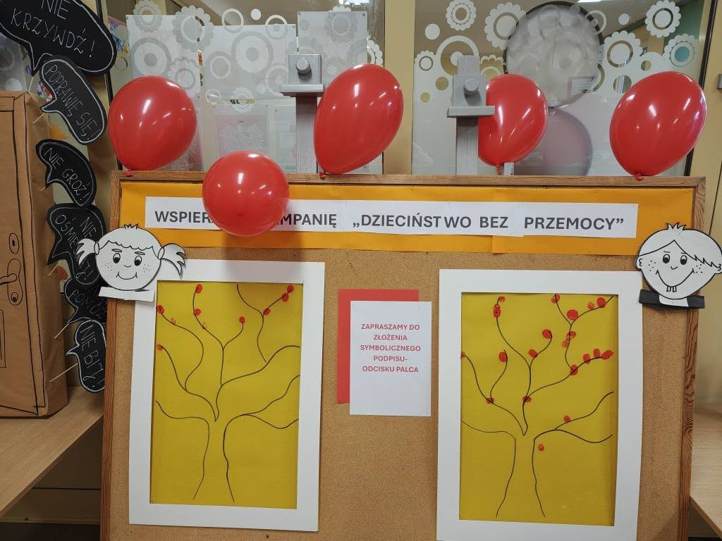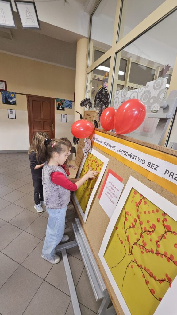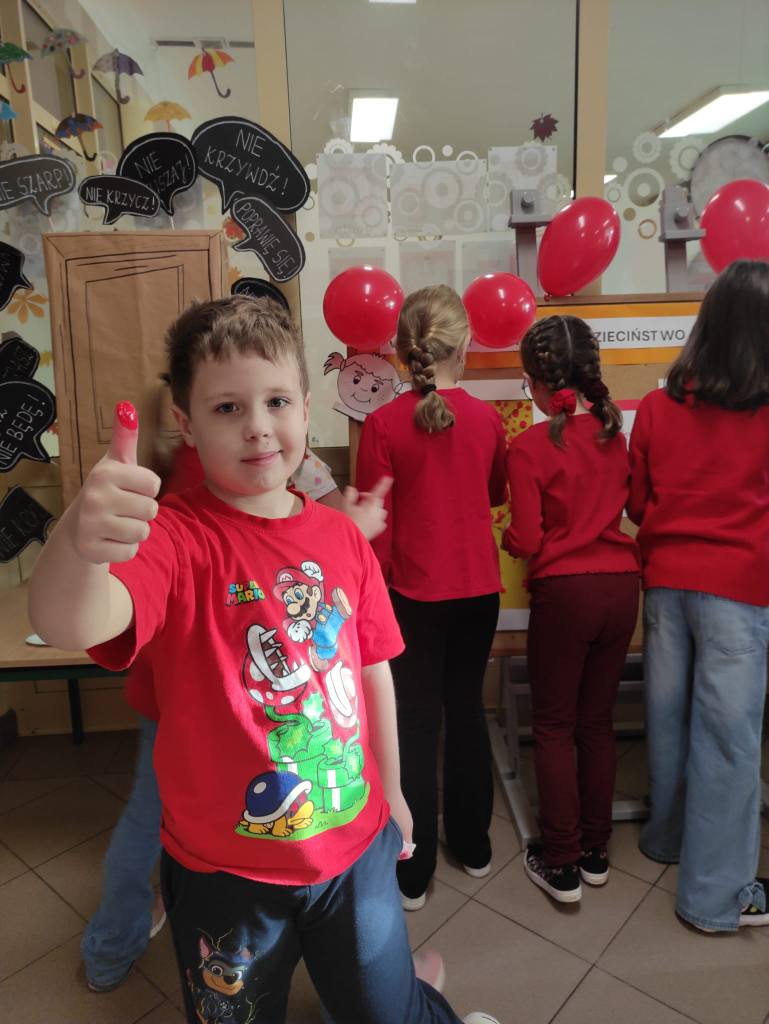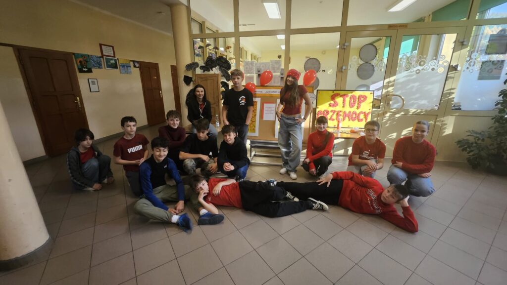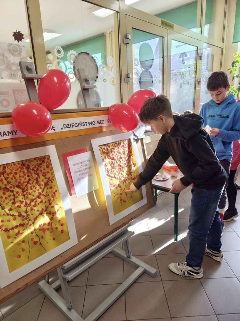 14 listopada w związku z ogólnopolską kompanią ” Dzieciństwo bez przemocy „w naszej szkole odbyły się różne zajęcia i akcje promujące właściwe zachowania wobec dzieci. Wyrazem wsparcia kampanii były symboliczne podpisy uczniów- odciski palców. W klasach odbyły się pogadanki, najstarsi uczniowie ułożyli na sali gimnastycznej hasło ” Stop przemocy „. Kulminacją akcji będzie podświetlenie szkoły na czerwono jako wyraz poparcia dla kampanii. Dziękujemy wszystkim za zaangażowanie, a naszym uczniom życzymy dorastania w spokojnym, wspierającym środowisku- bez agresji i przemocy.