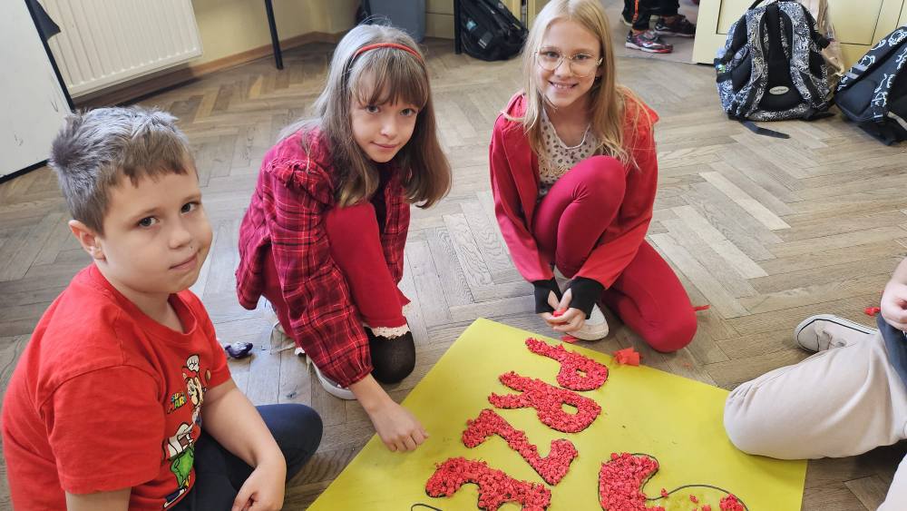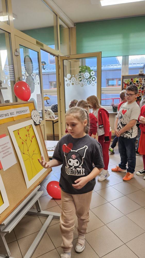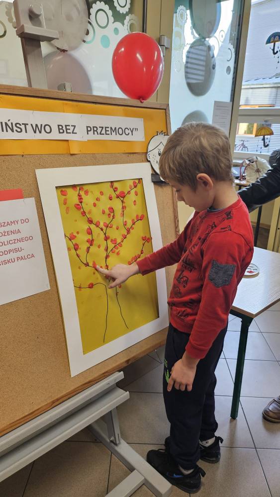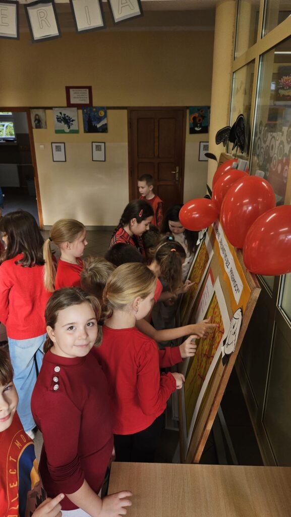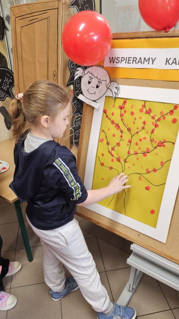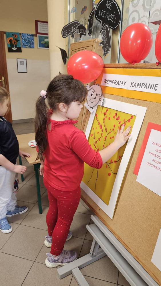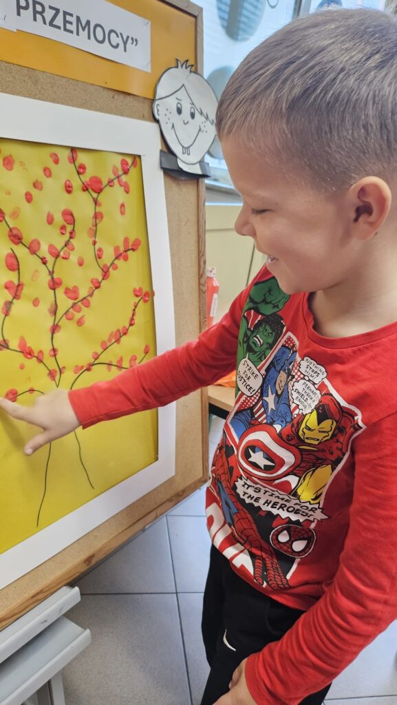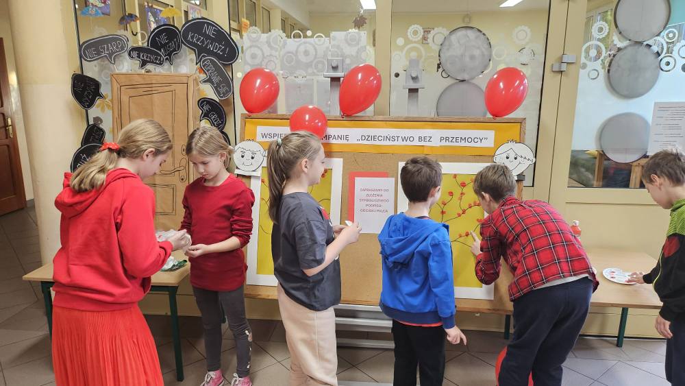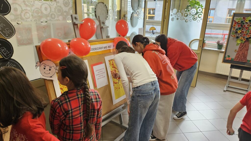 14 listopada w związku z ogólnopolską kompanią ” Dzieciństwo bez przemocy „w naszej szkole odbyły się różne zajęcia i akcje promujące właściwe zachowania wobec dzieci. Wyrazem wsparcia kampanii były symboliczne podpisy uczniów- odciski palców. W klasach odbyły się pogadanki, najstarsi uczniowie ułożyli na sali gimnastycznej hasło ” Stop przemocy „. Kulminacją akcji będzie podświetlenie szkoły na czerwono jako wyraz poparcia dla kampanii. Dziękujemy wszystkim za zaangażowanie, a naszym uczniom życzymy dorastania w spokojnym, wspierającym środowisku- bez agresji i przemocy.