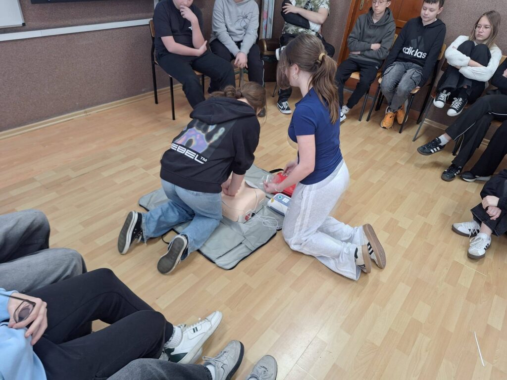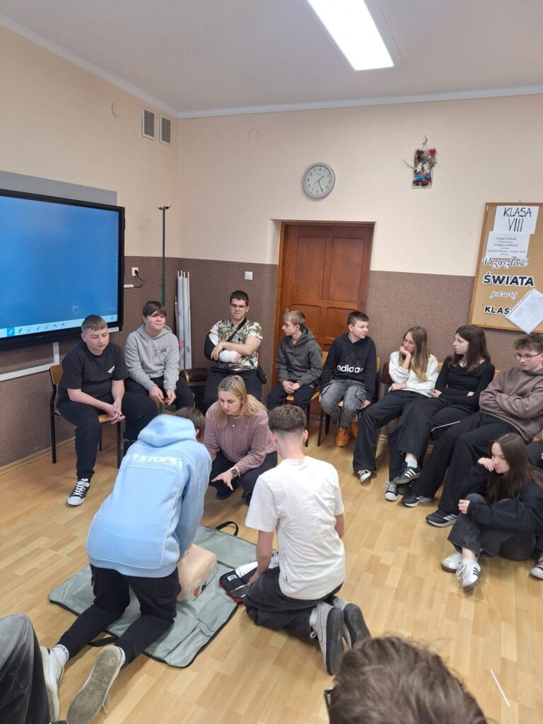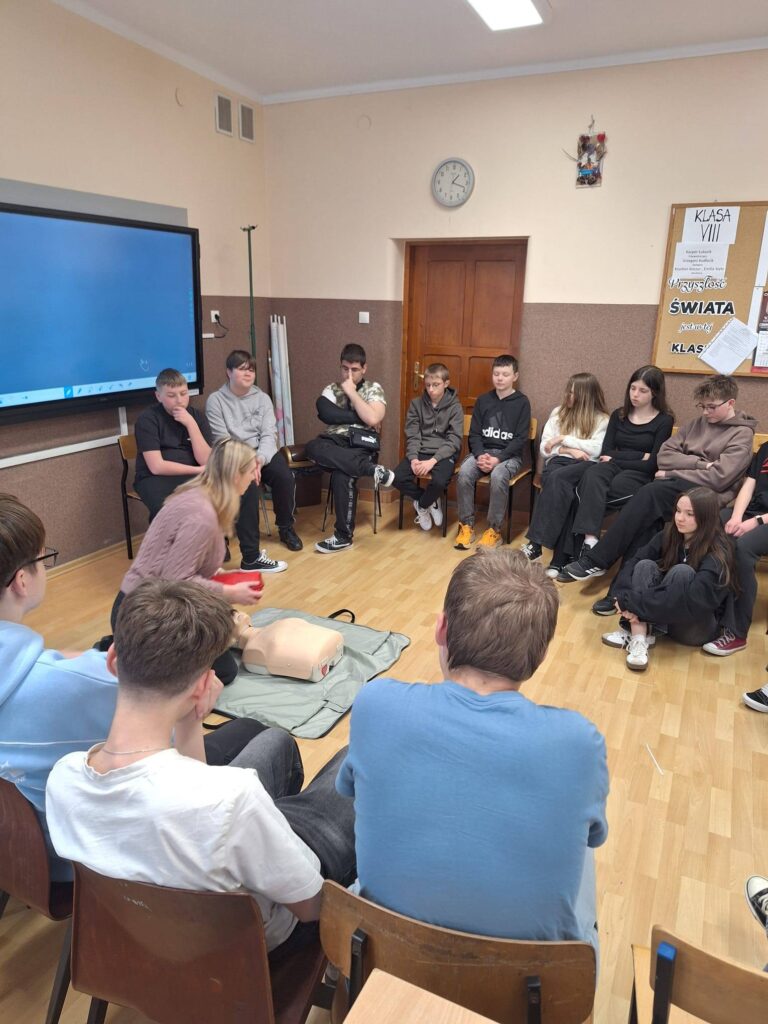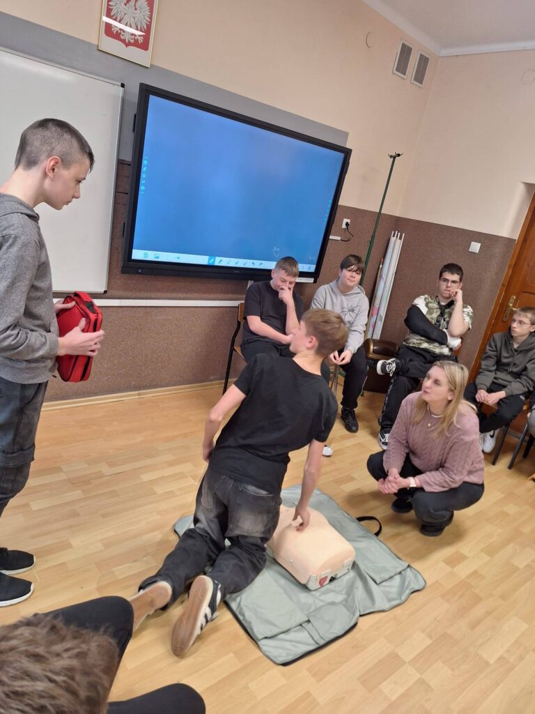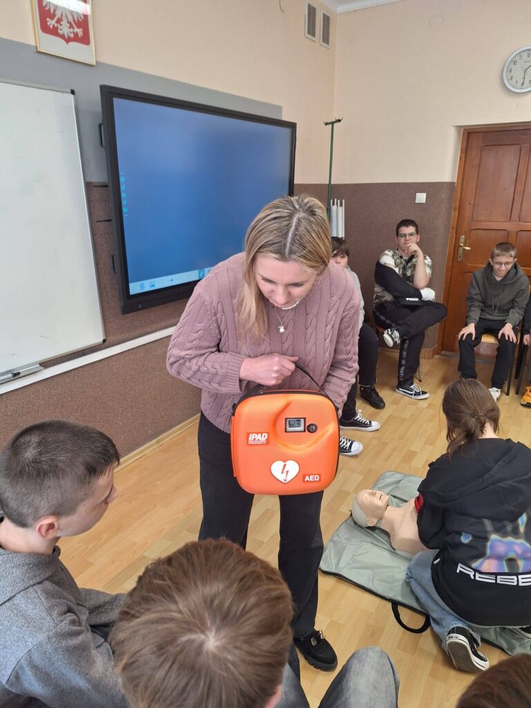 W związku z tym, że nasza szkoła od pewnego czasu posiada defibrylator AED, nauczyciele i uczniowie szkolą się, jak z niego skorzystać, by uratować życie. Szkolenia dla uczniów prowadzi pani pielęgniarka Izabella Kołaczyk.